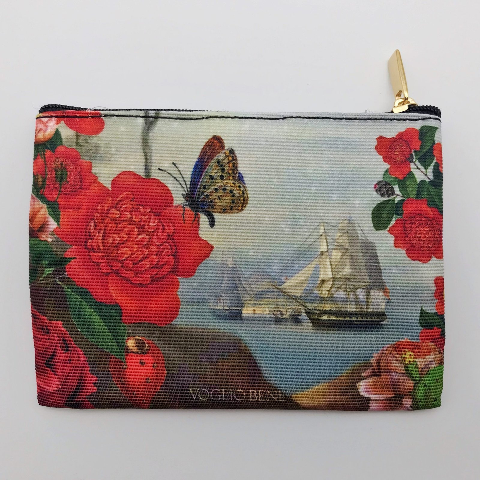 Coin purse format 9,5X14cm printed on polyester canvas. Front and back. Finished with black zip and inner lining